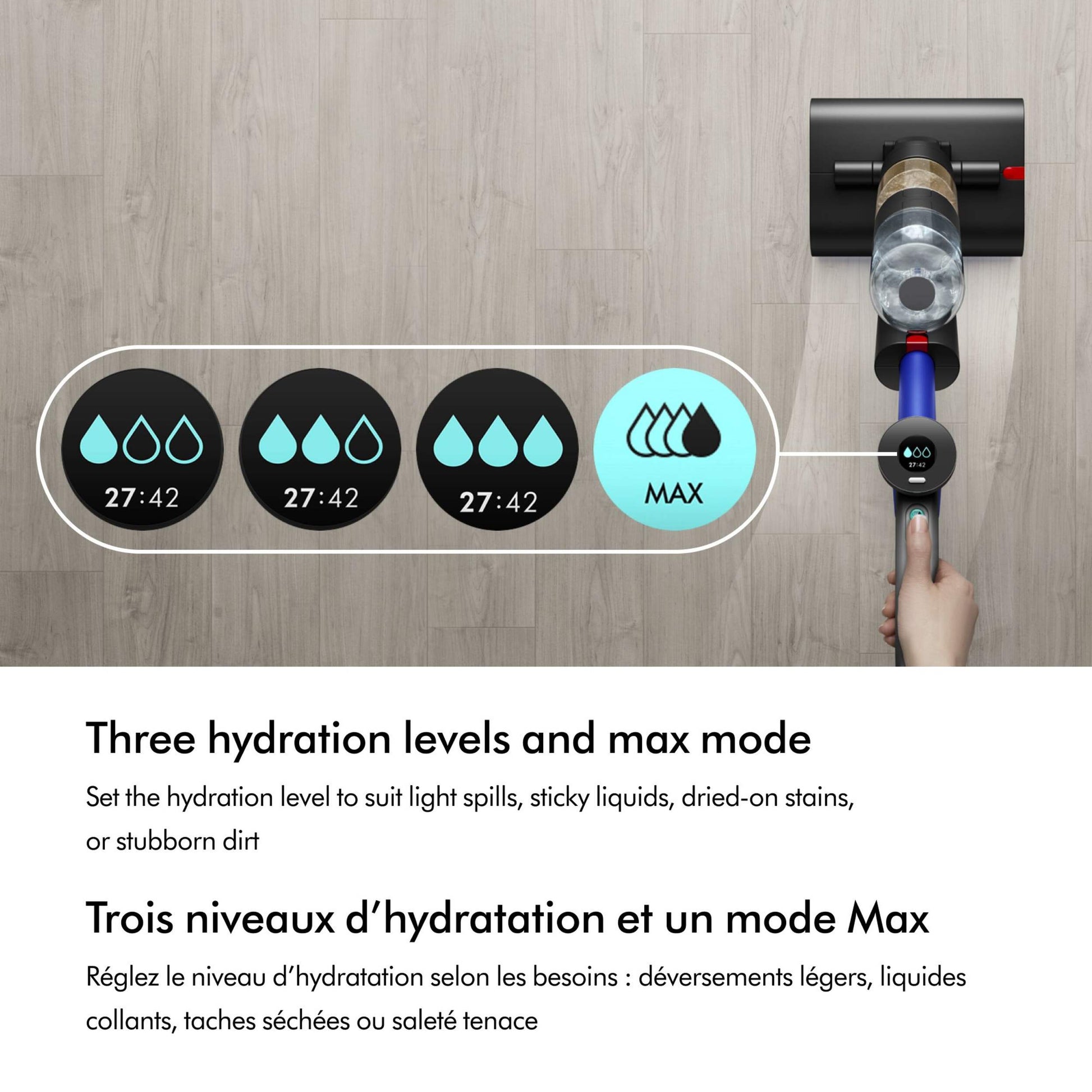 - 3 Hydration Levels & Max Mode: Adjust to handle everything from light spills to tough stains and sticky messes.