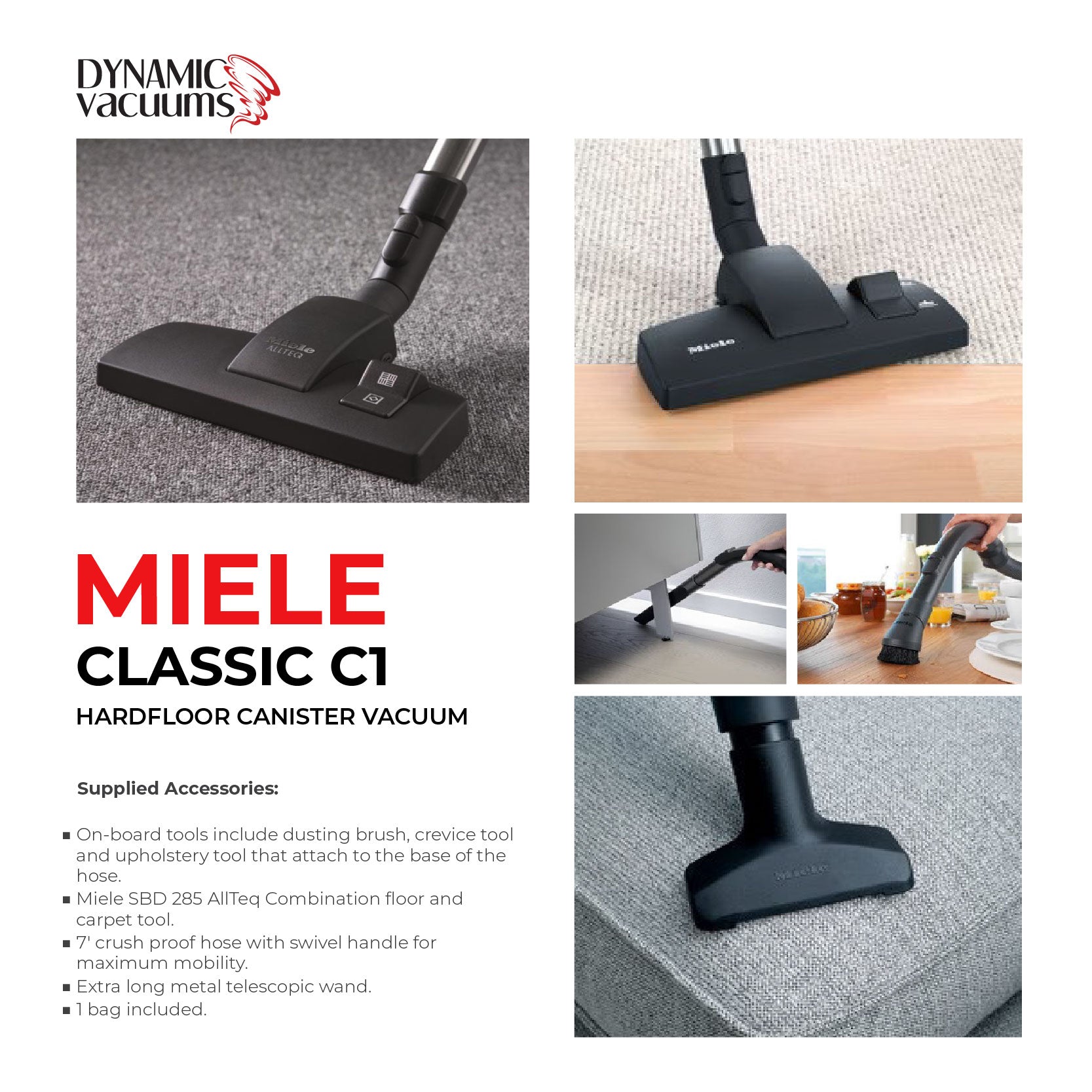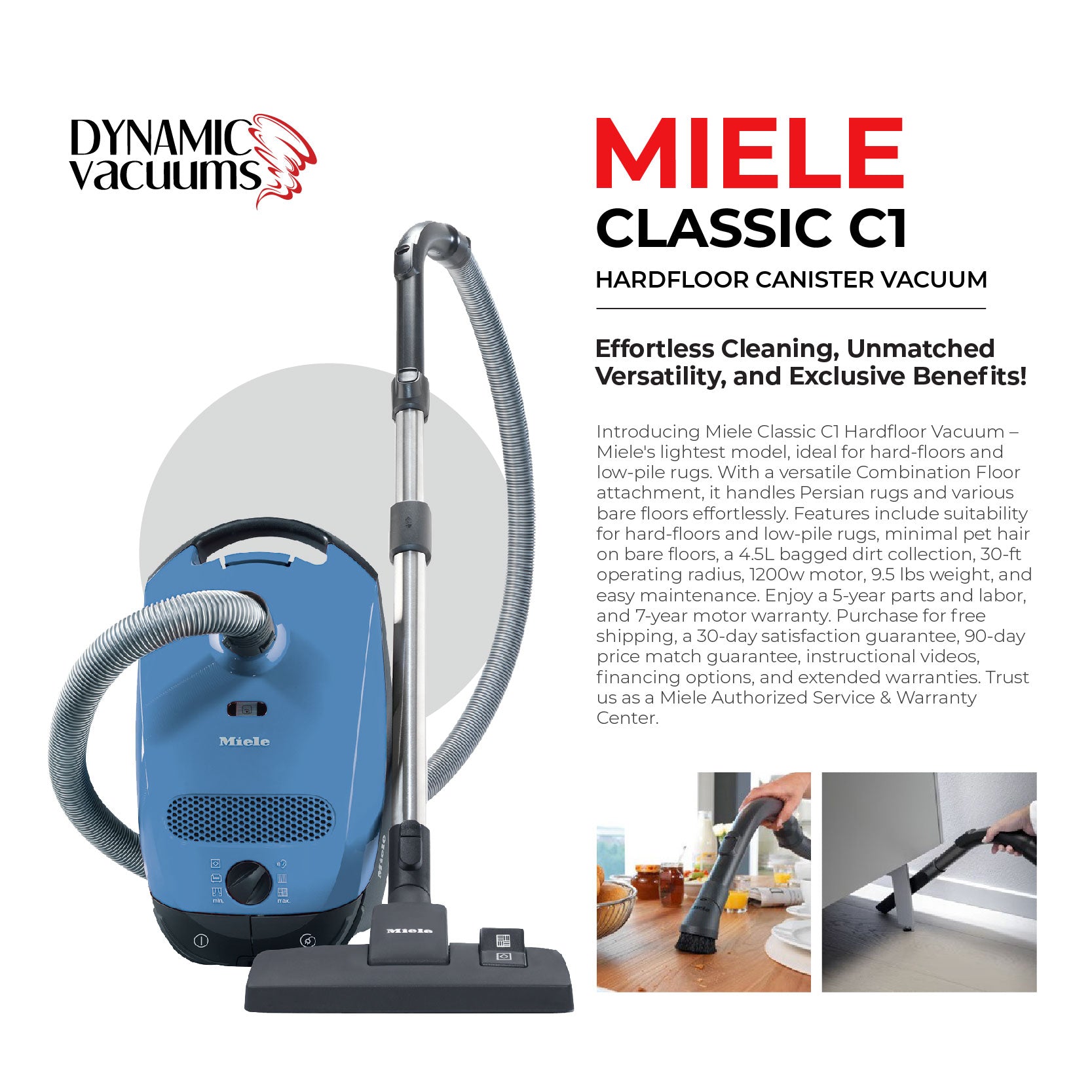 Looking for an economical high performance vacuum cleaner to clean your bare floors? Meet the Miele Classic C1 Hardfloor Canister Vacuum with its complete set of attachments that will do an amazing job at cleaning bare floor and flat carpet. It is powered by the famously quiet 1200 watt Vortec German motor. You can pick up dirt, dust and allergens with a quick pass of the combo tool. Easily switch between bare floors and low pile carpet by simply stepping on the head's lever instead of having to switch tools. The combo tool is perfect for cleaning low carpets with minimal traffic because there is no agitation that may cause premature wear on looped carpets or delicate area rugs. The Miele C1 Canister Vacuum has the full size 4.5 litre GN bags which has 9 layers of fleece which holds in the finest dust particles. Miele also includes a Super Air Clean filter for added filtration and allergen reduction. If weight is a concern you can rest assured that this model is one of the lightest canister vacuums available weighing in at 9.75 pounds. This vacuum is made in Germany. Key Features: