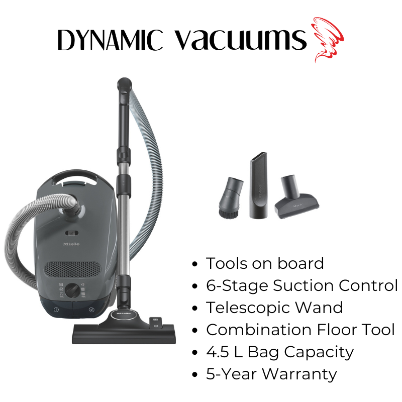 - On-board tools include dusting brush, crevice tool and upholstery tool that attach to the base of the hose with VarioClip.