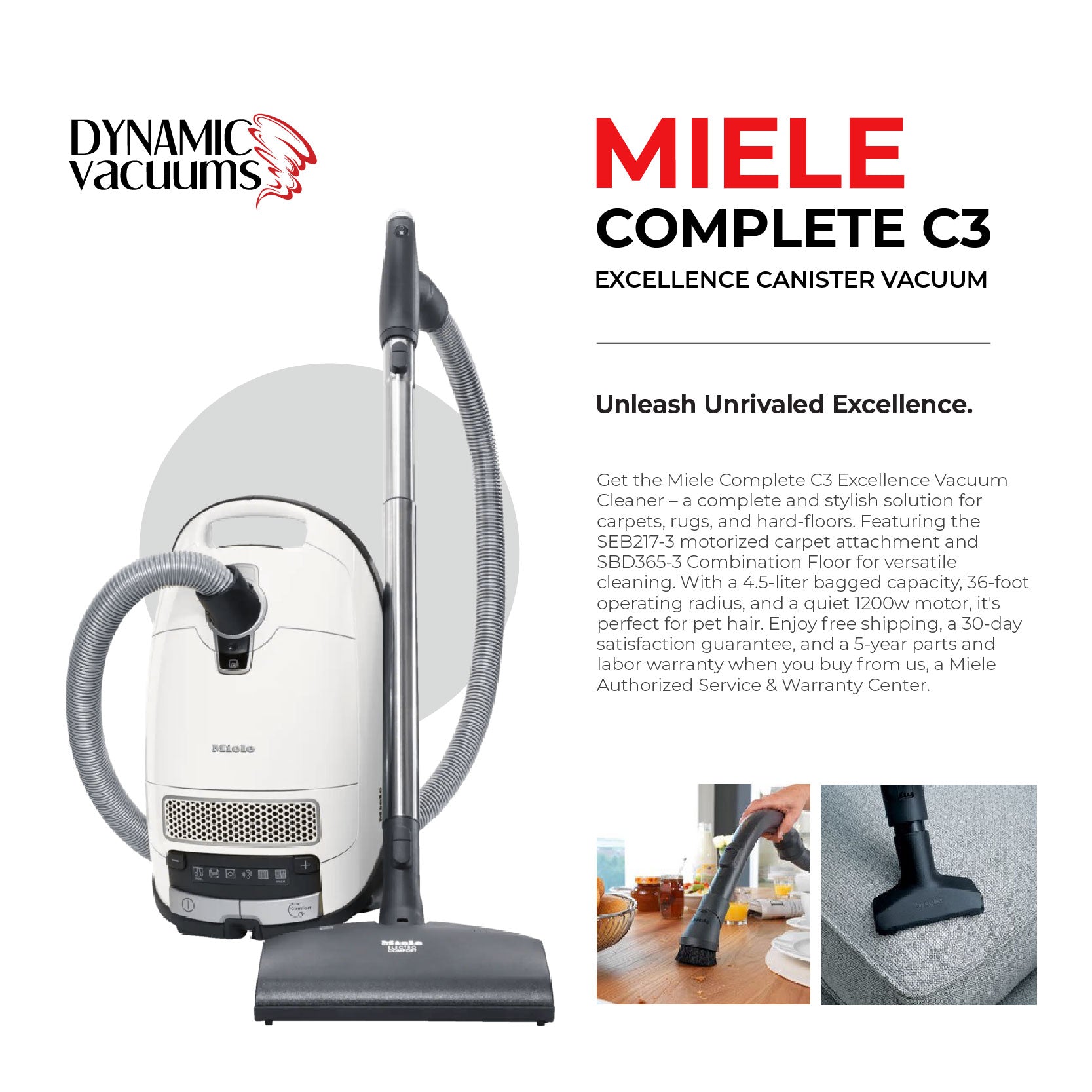 The Miele Complete C3 Excellence canister vacuum is ideal for gentle cleaning of sensitive hard floor surfaces and low-medium pile carpet and area rugs. It offers a wide range of convenience features including integrated accessories, a large operating radius, foot power controls, automatic power switch-off and more.