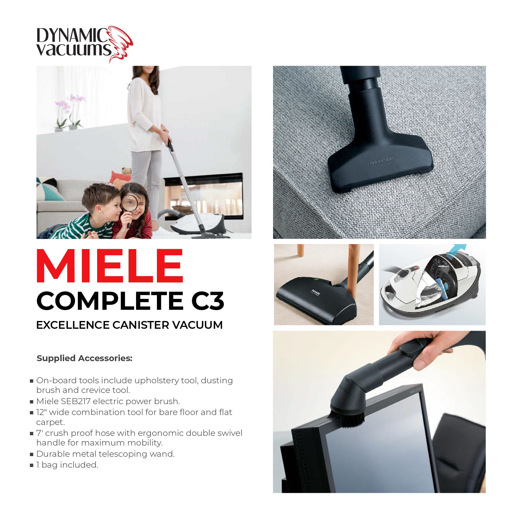 - Includes Vacuum, hose, wand, electric powerhead (SEB 217-3), universal floor brush (SBD 285-3), dusting brush, crevice nozzle, upholstery nozzle, AirClean 3D dust bag, AirClean exhaust filter, motor filter and owner's manual