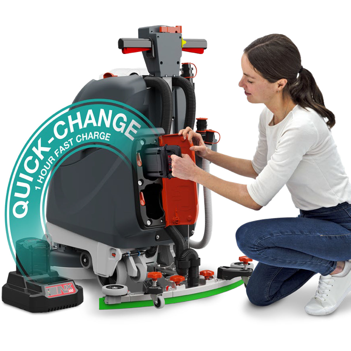 The NaceCare TGB817NX is the perfect balance of compact design and powerful, full-width cleaning performance. It’s easy to transport and features a fully adjustable handle for optimal ergonomics, making it comfortable for any operator. In just minutes, you'll achieve clean, dry, and safe floors. Powered by two NX300 Lithium-ion batteries, the TGB817NX provides up to 90 minutes of uninterrupted cleaning with 8-gallon solution and recovery tanks.