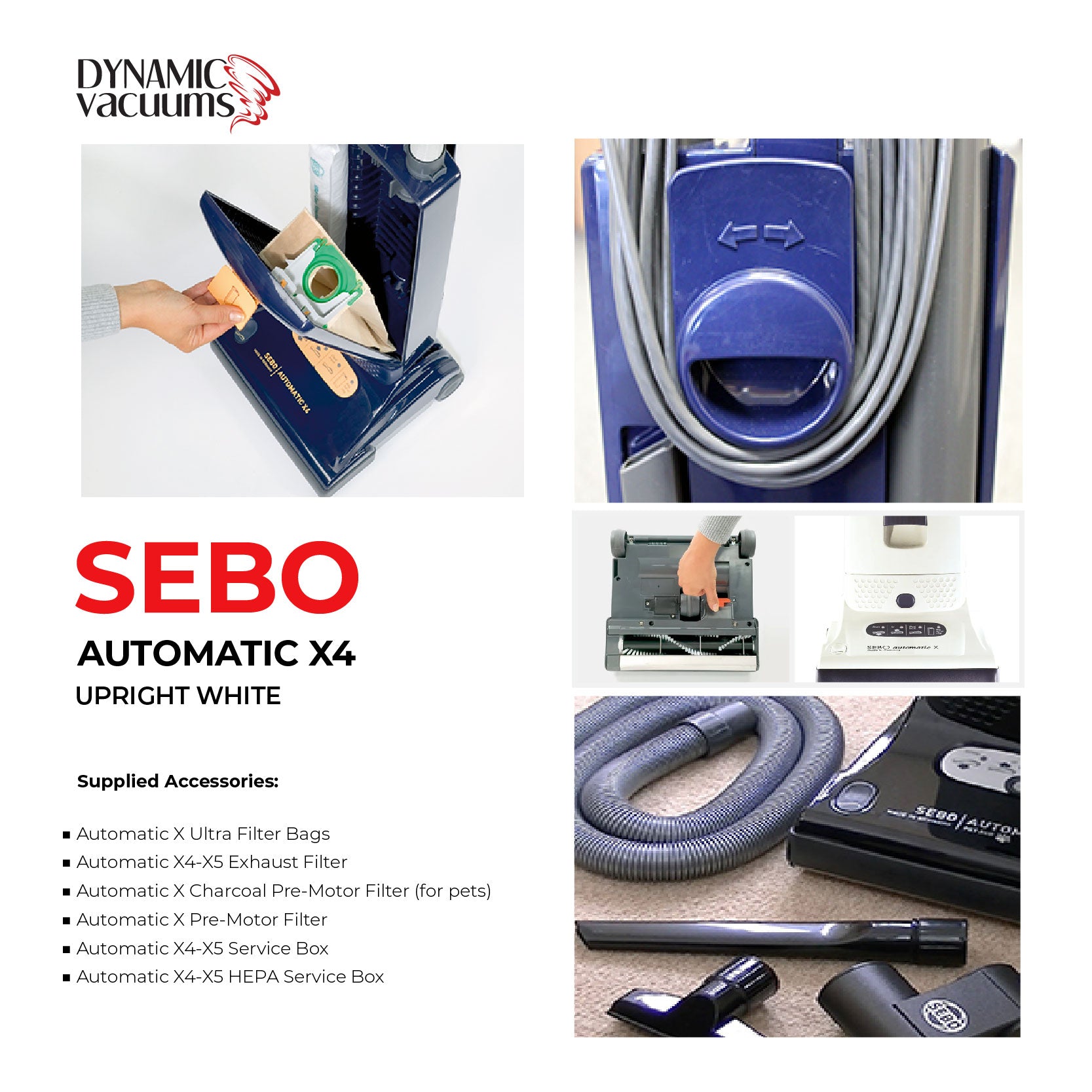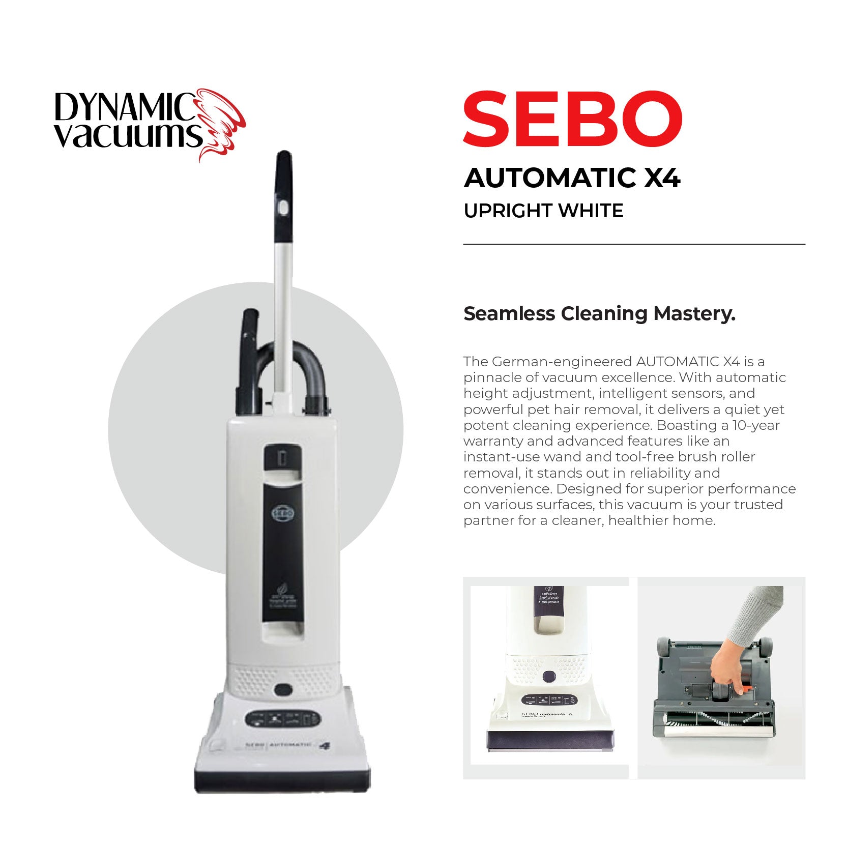 Made in Germany, the AUTOMATIC X series are the best commercial-grade, upright vacuum cleaners in the world because they are technically advanced and uniquely easy to use! . They have truly automatic height adjustment, to ensure optimum performance on carpets and hard-floor surfaces along with superb pet hair removal. Features Include an electronic controller that acts as a brain, measuring the resistance of the spinning brush roller against the floor and adjusting the power head up or down to the appropriate cleaning height. The sealing strip located behind the brush roller further improves hard floor cleaning performance, by channelling the airflow and preventing debris kickback. Users are alerted to a worn brush, and the vacuum shuts off automatically when a full bag, a clog, or a brush roller obstruction occurs, which protects the motor, belts and carpets from damage. 10 Year Warranty The AUTOMATIC X4 is powerful, yet quiet, and will provide years of reliable use! It also has a convenient instant-use cleaning wand and suction hose with an eight-foot reach, three on-board tools, a lifetime belt warranty, plus a five-year warranty on other parts and labor. Additional features include excellent filtration, a giant 1.4-gallon bag, an extra long 40-foot cord, rubber-coated wheels to protect floor surfaces, a low 5.5-inch horizontal cleaning profile that fits under beds and furniture, and tool-free brush roller removal for replacement or bristle cleaning. MADE IN GERMANY Features :