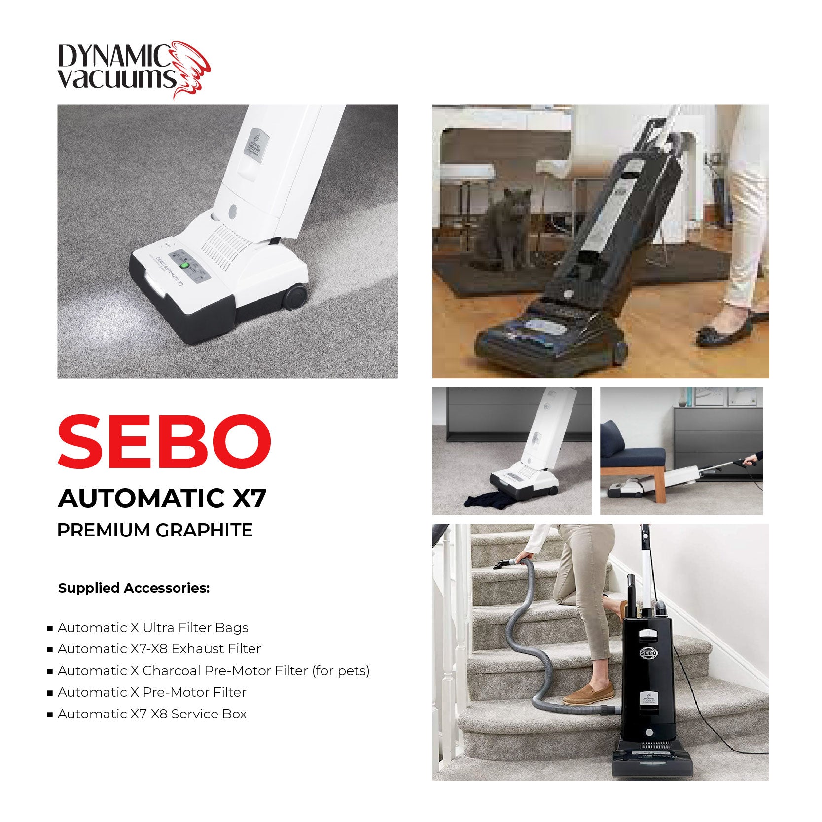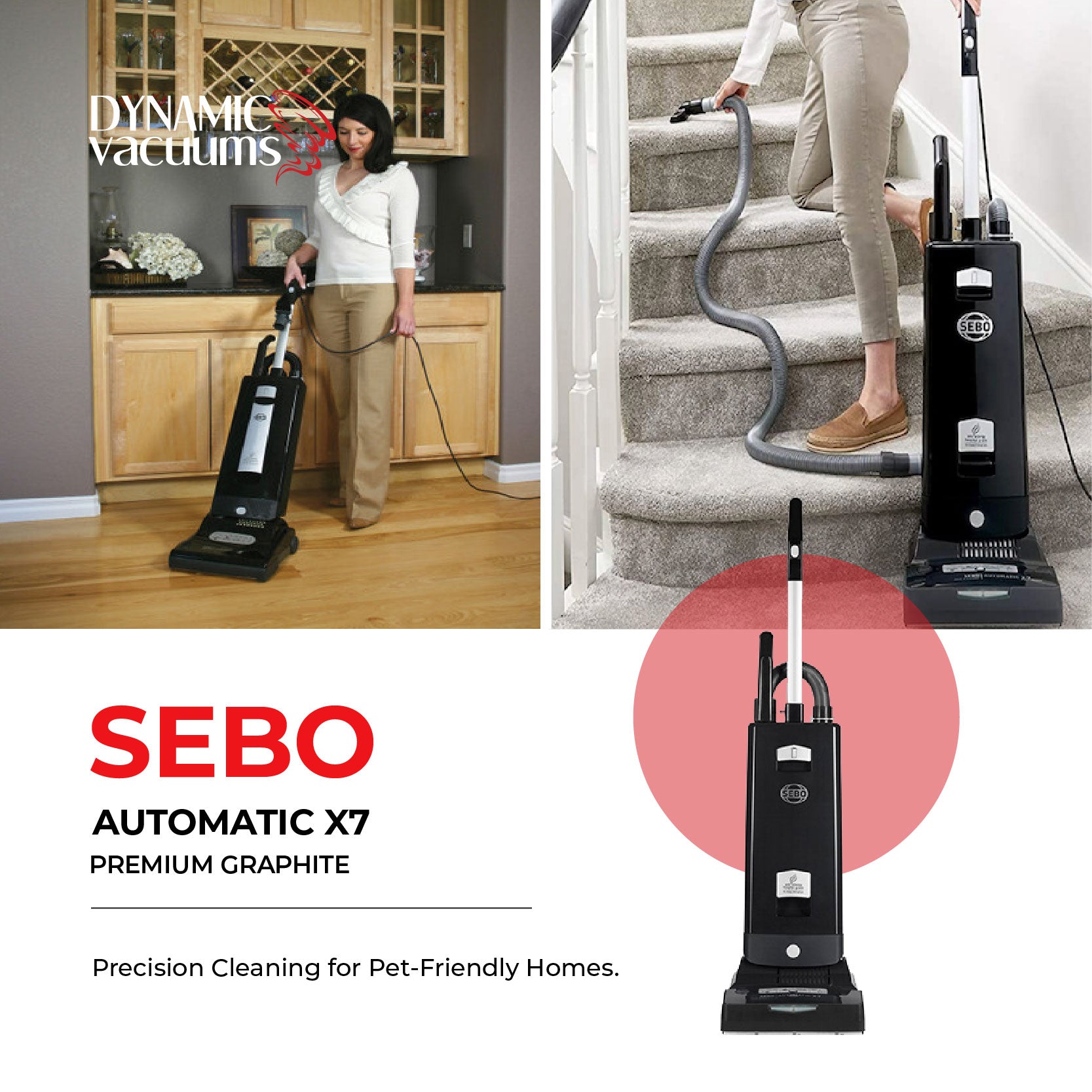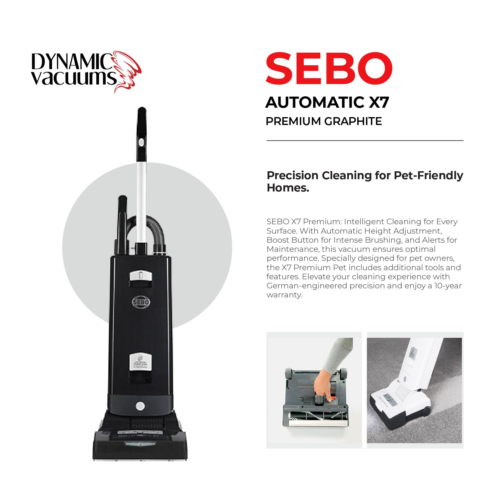 The 12” X7 and X7 Premium, as well as the 15” X8 all feature truly automatic height adjustment so you always know your brush is set to the perfect height for your carpet or hard floor. Feeling ambitious? Press the Boost Button on the X7 Premium and the spinning brush will lower itself to do more intense brushing. It also features a head lamp to help you see dirt and dust more easily as you vacuum. No need to guess about clogging, worn brushes or full bags either – AUTOMATIC X vacuums alert you when these things happen, making vacuum maintenance easy as pie. Our special X7 Premium Pet was made for homes with dogs and cats in mind. It features an included extension hose, hand-held turbo brush and comes equipped with a charcoal filter to cut down on odours from vacuuming pet hair and dander. Features: