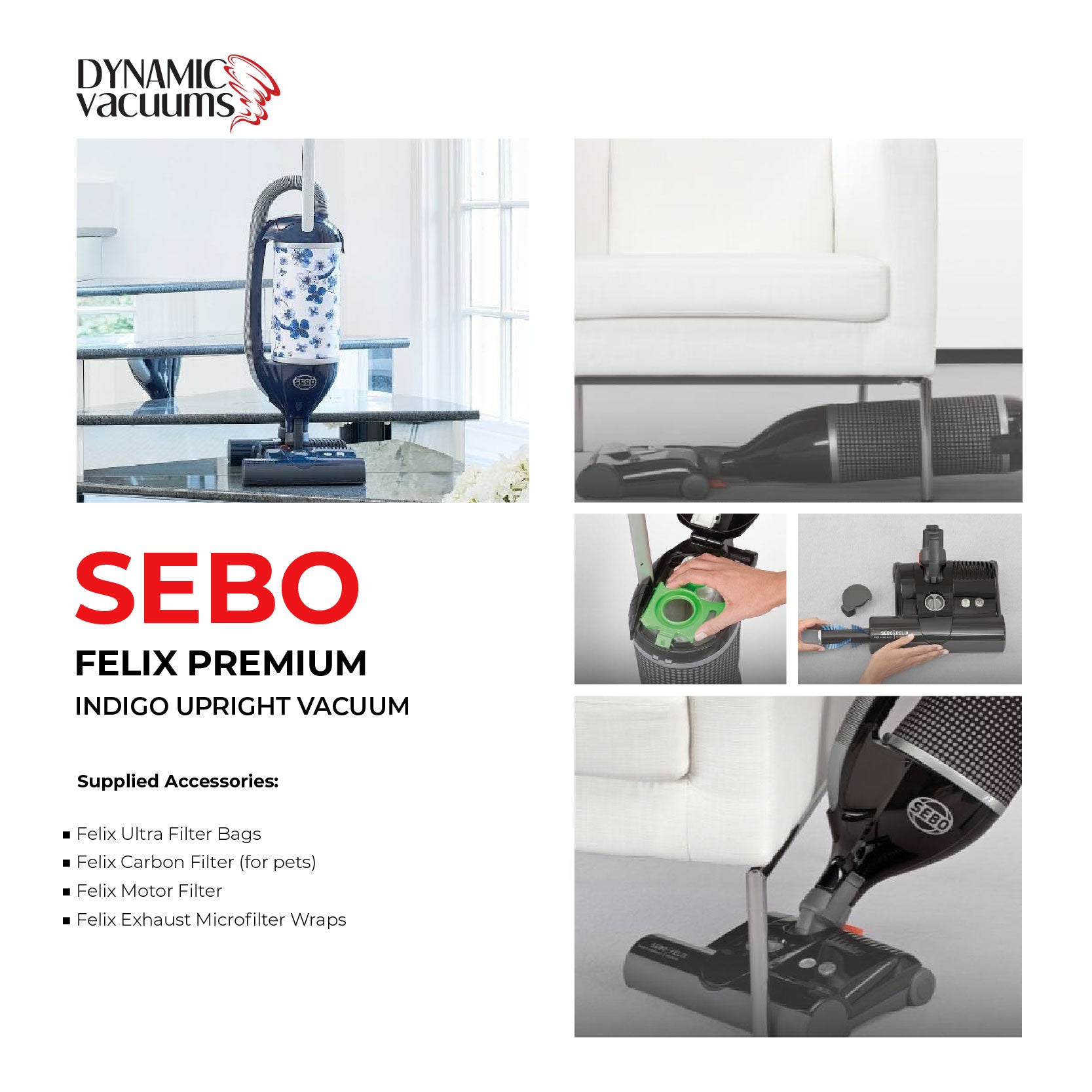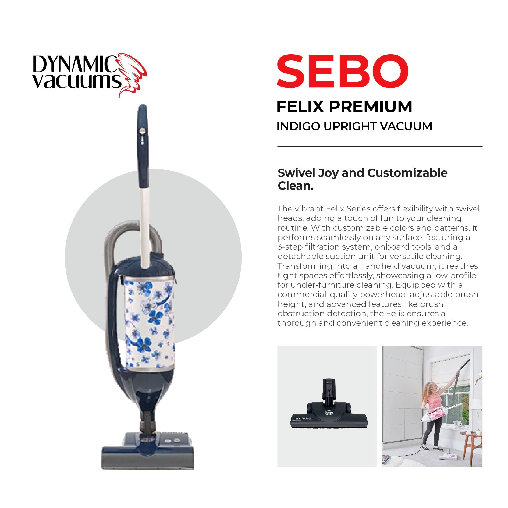 SEBO Felix Premium upright vacuum with a 12″ power head Manoeuvre around large areas of your floor from any angle with FELIX 1 PREMIUM’s flexible swivel neck and large 12” power head. Then reach those smaller areas using the conveniently attached hand hose and attachment tools. To clean delicate carpets, simply turn off the roller brush for no-spin cleaning. Or detach FELIX’s suction unit and use it as a hand-held vacuum for small jobs. A sliding suction control switch even lets you turn down the intensity for extra-delicate surfaces. Made In Germany 10 Year Warranty