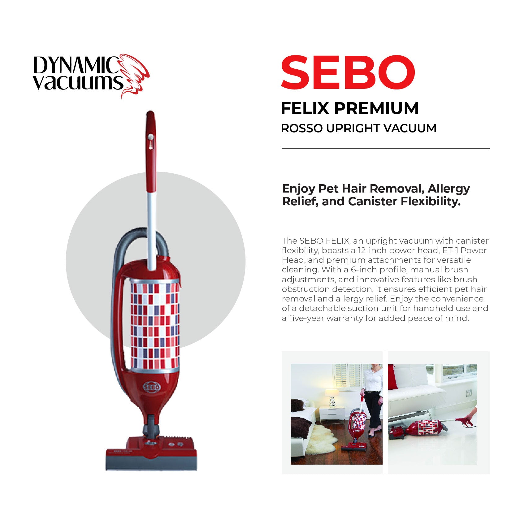 The Sebo Felix 1 Premium is A Lightweight Upright Vacuum Cleaner With Quick Turn Swivel Necks And Large Side Carrying Handles, Which Make It The Most Maneuverable And Portable Upright Vacuum. The Felix Vacuum Cleaners Are Compact, But Still Offer A 1300-watt Motor And An Excellent S Class Hepa Equivalent Filtration System. They Come Complete With A Manual Height Adjusting Power Head. Made In Germany Features: